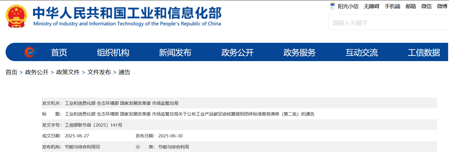 工業(yè)和信息化部等四部門關(guān)于公布工業(yè)產(chǎn)品碳足跡核算規(guī)則團體標準推薦清單(第二批)的通告